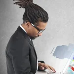 Focused professional at laptop as multiple documents and binders are handed from both sides
